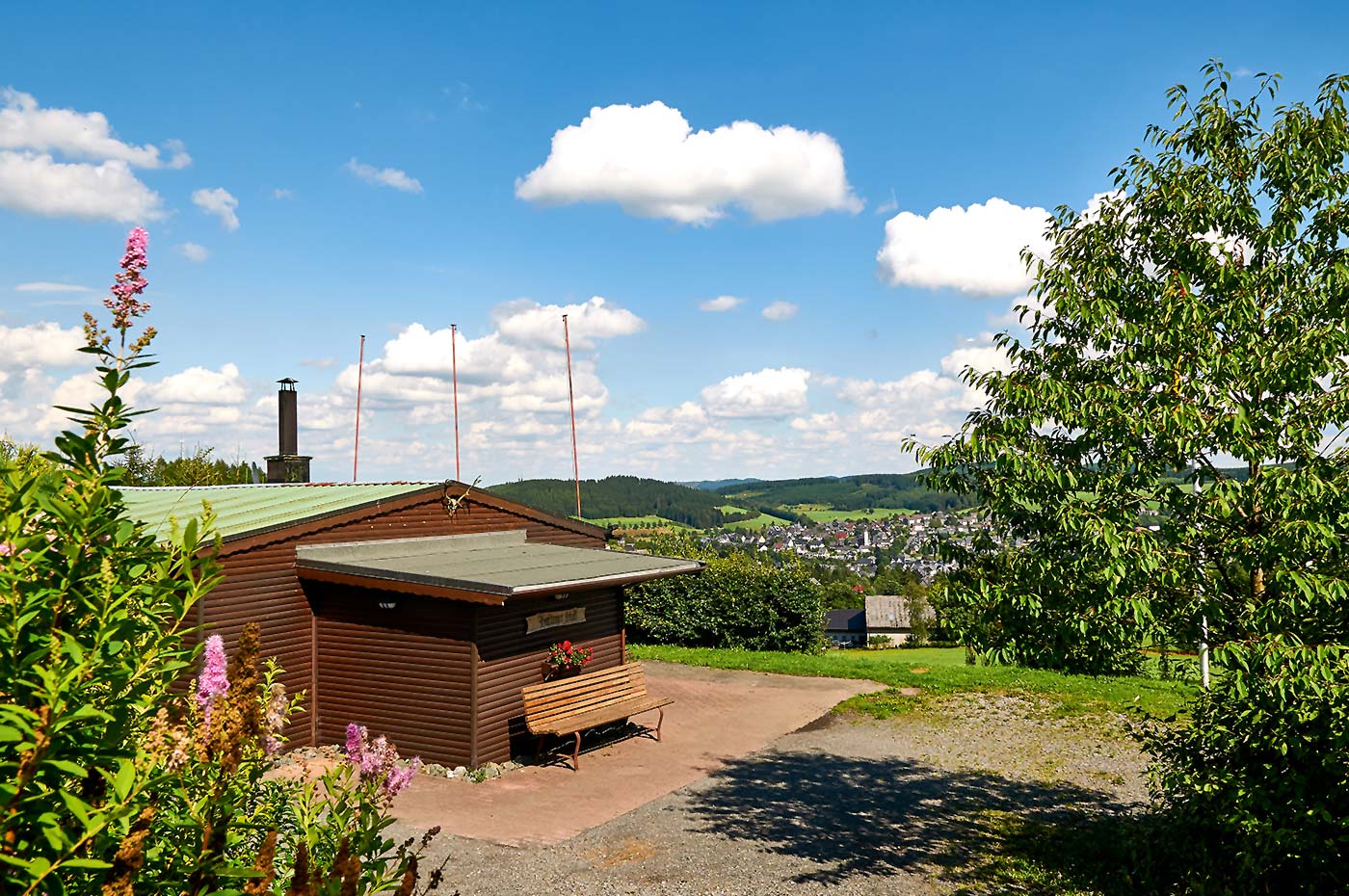 Die Haflinger Hütte liegt exponiert auf dem Hachenberg in einer Höhe von rund 600 Metern oberhalb des Edertals. Von hier bietet sich ein Panoramablick über den Ort Erndtebrück im Tal und die umliegenden Dörfer und Wälder. Nach Westen und Süden hin erstreckt sich das obere Edertal, nach Osten und Norden schaut man ins Wittgensteiner Land. Diese offene Höhenlage verleiht der Hütte ihren einzigartigen Reiz: Besucher haben das Gefühl, dem „alltäglichen Leben“ zu entfliehen und in der Natur ungestörte Stunden verbringen zu können. Rings um die Hütte befinden sich Wiesen und am Rand auch Waldstücke, sodass eine idyllische, grüne Umgebung garantiert ist. Abends kann man von dort oben spektakuläre Sonnenuntergänge beobachten, und nachts ist der Sternenhimmel fernab von Siedlungslichtern besonders klar.